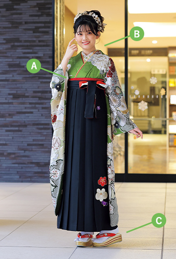 A:振袖の豪華さとのバランスを考えて、半幅帯は袴とコントラストが強い色をセレクト。たもとや顔周りのポイントカラーを選べば失敗なし。
