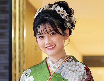 ヘアスタイルは毛先を強めに巻き、弾むように高い位置のポニーテールに。リボンや小花のヘアカチューシャがキュート。前髪は自然にカールさせて流し、エアリー感を出して。ハタチのセレモニーとはひと味違う、遊び心のあるスタイルで差をつけて。