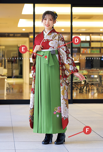 E:袴のリボンにあしらわれた小花が、振袖の紋様と絶妙にリンク。コーデに統一感が生まれ、愛らしさもアップします。