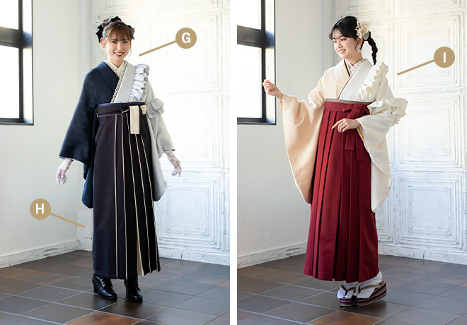 H:ノーブルなイメージの濃い色の袴。プリーツ部分のアクセントカラーが縦長シルエットを強調し、スタイルアップして見えます。