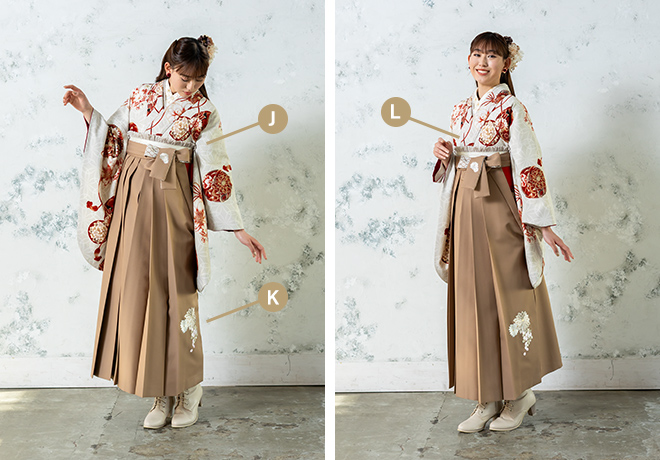 J:クラシカルなベージュの袴に、白い刺繍がさわやか。リボンにはレースのあしらいもあり、ディテールへのこだわりが感じられます。